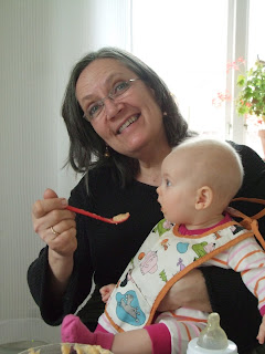Inatt har Moa sovit hela natten i sin säng igen, helt underbart. Jag vaknade av att hon gnydde lite strax innan 7 och när man kom in i rummet hänger hon på spjälsängsskyddet och avfyrar ett flin :) Så då är det bara att stiga upp och käka lite gröt.